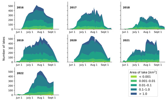 Figure 9 shows the evolution of the number of SGLs and their size distribution over the 2016 to 2022 melt seasons. The lakes were sorted into five bins based on their area, where the smallest lakes (<0.001 km2) are represented by light green and the largest lakes (>1.0 km2) are represented by dark blue. Each bin is stacked upon the previous one, cumulating in the total number of lakes. Thus, the height of each color represents the number of lakes in the respective bin. For most years, a similar maximum number of lakes can be seen, with an average of 520 lakes, excluding the 2018 melt season, which only reached a maximum of 294 lakes. This information, along with details about the average lake size on peak days, can be found in Table 3. Here, it can be seen that the average lake size varies quite drastically among the melt seasons. Furthermore, as expected, the day on which the peak number of lakes occurs tends to coincide with the maximum total lake area for each melt season.