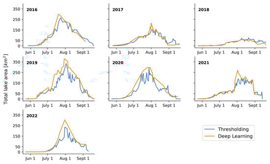 Yearly comparisons between daily lake-area totals for both the thresholding method [16] and the deep learning method developed in this study.