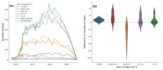 (a) Number of lakes grouped by their size for both the deep learning method (solid lines) and thresholding method (dashed lines) for the 2019 melt season. Only days where data were available for both methods are plotted. The colors represent five categories based on their area, where the smallest lakes (<0.001 km2) are represented by blue and the largest lakes (>1.0 km2) are represented by green. The y-axis represents the number of lakes in each bin per day, cumulating in the total number of lakes. (b) Distribution of the difference in number of lakes detected by both methods (the thresholding method subtracted from the deep learning method), displayed as a violin plot. The colors correspond to those in (a). Each horizontal line within the shapes represents one data point.