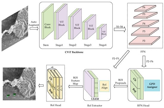 As shown in Figure 2, CViTF-Net consists of five parts: the CViT backbone, FPN, RPN head, RoI extractor, and RoI head. The CViT backbone relies on fused CNNs and visual transformers to extract features from the input image, outputting four feature maps on different scales, from S1 to S4. The FPN performs feature fusion on the four scales of input feature maps, outputting five new feature maps, from P2 to P6. Three prior boxes with different aspect ratios are generated for each feature point on the five feature maps. The GPD assigner initially converts the priors and ground truths into their corresponding two-dimensional Gaussian distributions, then calculates the discrepancy between these two distributions using the Kullback–Leibler divergence (KLD). This discrepancy can measure the similarity between the ground truth and the prior box, identifying whether a prior box is a positive sample. For each image, the RPN head outputs 1000 region proposals. The RoI uses four feature maps with different scales of output by the FPN, transforming different region size proposals into four groups of 7 × 7 in the RoI feature maps. The LSAM performs convolutional fusion pre-processing on the four RoI feature map groups, assigning weights based on different attention scores within the feature maps. Small ship targets are classified and regressed using two bounding box heads cascaded on the RoI head to enhance detection performance.