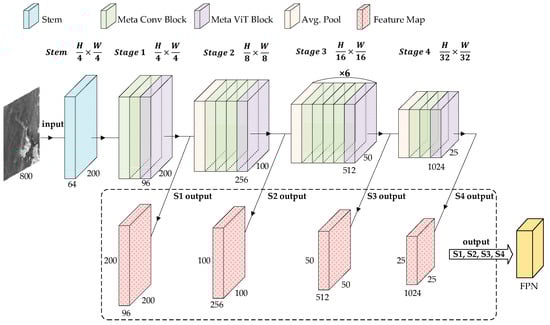 In SAR images, small ship targets often confront complex spatial features, such as noise and clutter. The backbone network must process local and global information for feature representation. Therefore, we developed a CViT backbone, as shown in Figure 3. The Meta Conv Block extracts and transforms the input features via grouped convolution and a multi-layer perceptron (MLP). The Meta ViT Block, comprising the multi-head, self-attention and MLP, models the global dependencies and high-level abstract features of the input features.