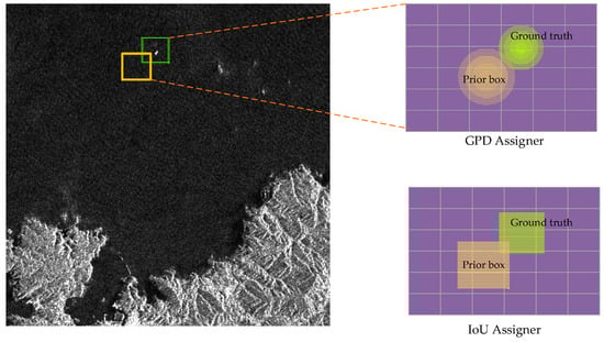 Figure 5 demonstrates the difference between the GPD assigner and the IoU assigner. In a traditional IoU assigner, if a prior box has a small overlapping area with a ground truth box, its IoU value would be small, even if their centers are very close. Consequently, some prior boxes near the ground truth box but without full overlap could be mislabeled as negative samples. On the contrary, the GPD assigner emphasizes the center position of the box, while considering the shape and size of the box, thus providing a more refined measurement of the similarity between the two boxes. In GPD, two-dimensional Gaussian modeling is employed for prior boxes and ground truth boxes. The center of the two-dimensional Gaussian distribution represents the target’s location, while the variance signifies the uncertainty and fuzziness of the position. This enables us to better represent the potential location range of small ship targets. Moreover, the Gaussian distribution has higher probability density near the target’s location, indicating that our method is more likely to distinguish the targets from background clutter in this area. Therefore, GPD can retain a greater number of effective positive samples.