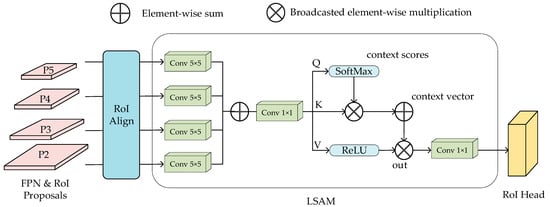 Generally, the contrast between the targets and the background in SAR images is low. We proposed the LSAM to help the model effectively capture the subtle feature differences between small ship targets and the background. In the extraction of the RoI feature maps, we used RoI align [54]. Firstly, we mapped the RoI coordinates onto the feature maps output using the FPN. The RoI area is then divided into small regions. Each small region is either upsampled or downsampled to obtain the feature values. Finally, we assembled these into 7 × 7 feature maps with 256 channels.