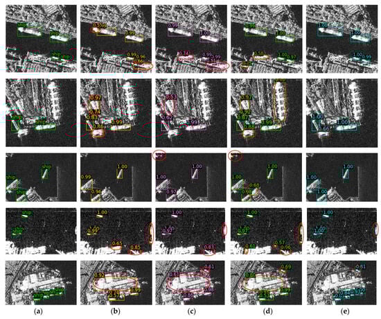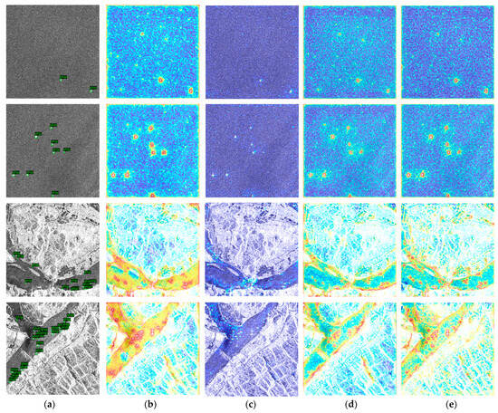 We created a feature map visualization experiment to understand the degree of attention each component in CViTF-Net pays to the different areas in the SAR images, as shown in Figure 12. Here, the colors range from deep blue to bright red, indicating attention levels from low to high. Figure 12a shows the ground truth, illustrating the actual positions of the small ship targets. Figure 12b displays the scenario without any enabled components, serving as a baseline (Cascade R-CNN) for comparison with the three innovative components proposed in our approach. The baseline detector is clearly influenced by noise, manifesting a tendency towards false alarms. Figure 12c demonstrates a situation when only the CViT backbone is activated. At this point, the detector demonstrates a stronger capability for global feature representation. In addition, the region of interest becomes more concentrated on small ship targets, while attention to the background significantly decreases. Figure 12d depicts a scenario where only the GPD assigner is employed. In this case, the detector pays more accurate attention to the location of the small ship targets. It refines the discrimination criteria for positive and negative samples using the two-dimensional Gaussian prior. Consequently, the detector emphasizes regions near the target center more during training. Figure 12e illustrates a case where only the LSAM is enabled. Due to the LSAM’s ability to better capture the details and context information about the target, observing the third and fourth rows in Figure 12, it can be observed that the detector’s perception range of the target is more refined, with a certain noise suppression effect when compared to the baseline (Figure 12b).