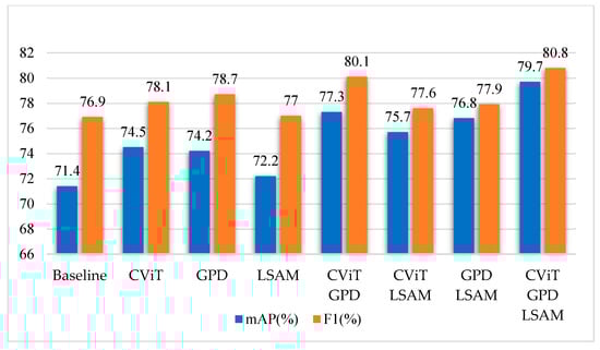 - CViT backbone (CViT): The detector’s recall, mAP, and F1 improved when only the CViT was enabled compared to not enabling any components, especially the recall and mAP, which increased by 3.6% and 3.1%, respectively. However, a slight decrease was observed in the precision, which can be attributed to CViT’s proficiency in capturing global information, possibly at the expense of some detail features. Despite this, the CViT significantly improves the overall performance of the detector.