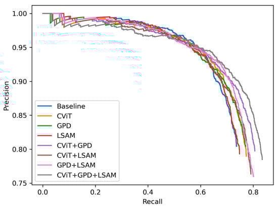 Figure 11 presents the PR curve for the ablation study. Overall, each component contributes to the performance improvement of the detector. CViTF-Net achieves the largest area under the curve and the best overall performance when all the components are enabled. This highlights the importance of the collaborative work of the CViT, GPD, and LSAM. Additionally, it validates the rationality and effectiveness of CViTF-Net’s design.