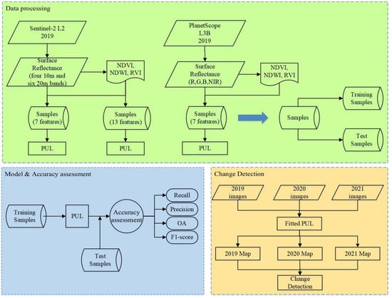 Remote sensing image change monitoring is a technique that quantitatively analyzes and determines the process and characteristics of feature changes based on remote sensing images of the same area over different periods [22]. It is widely used in disaster assessment, urban development, and land use/cover [23]. Common methods for change monitoring include the image difference method, the image ratio method, the principal component transform method, the vegetation index method, and post-classification comparison [24]. To improve the temporal transfer of the algorithm, we selected unlabeled samples from multiple periods. The change-detection-based sample transfer approach is efficient, simple, and robust and has the potential to be used in large-scale ground cover classification [25,26,27]. This study takes advantage of PUL’s ability to conserve negative sample information, reducing the statistical distribution differences between images of the target area by identifying areas of invariance between multiple temporal images [28], and combining the change-detection and post-classification approaches to solve the image classification problem of the target area [29]. A post-classification comparison is the most direct method of change monitoring. The advantage of this method is that it avoids the image sequence consistency conditions required for the direct comparison method, as well as avoids image radiation correction and matching problems. However, this method requires the development of uniform classification criteria enforced via image classification [30,31]. This method is extremely dependent on the accuracy of the classification algorithm, but this method performs well when analyzing the variation in a single species [32]. Therefore, this research uses a post-classification change detection approach for the analysis [33].