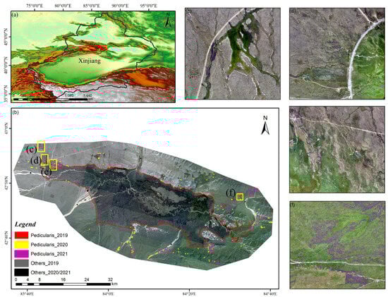 The aim of this study was to employ remote sensing techniques to obtain the temporal and spatial distribution of Pedicularis in Swan Lake and the buffer zone of the Bayinbuluke Grassland. Remote sensing data were collected in August for three consecutive years (2019–2021) to facilitate a comparison of the changes over time. Geospatial information holds valuable and significant data useful for the strategic planning of eradication efforts targeting Pedicularis infestations. Our objectives are as follows: