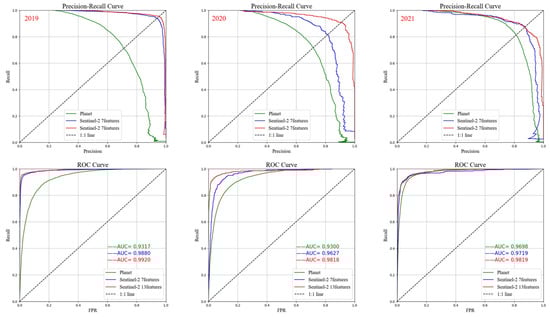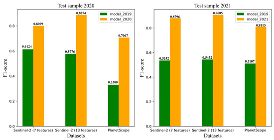 To evaluate the temporal transferability of the model, we tested the model developed in 2019 on data from 2020 and 2021. As illustrated in Figure 3, the model’s performance on this test was unsatisfactory, with the F1-scores for both years being less than 0.62. Specifically, the F1-score for the PlanetScope dataset in 2020 was insufficient, with a value of only 0.3300. Subsequently, upon training the model with the corresponding year’s training set, a notable improvement in accuracy was observed. These results demonstrate the potential of positive and unlabeled learning (PUL) for small-sample learning.