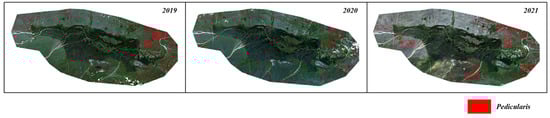 Spatiotemporal pattern of Pedicularis in 2019–2021 using Sentinel-2 data (13 feature).