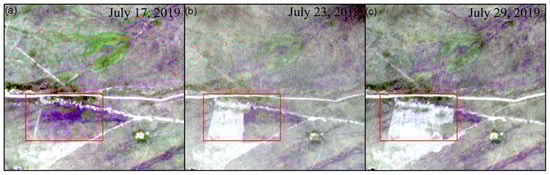 We learned that the government conducted a local campaign for the removal of Pedicularis in July 2019. To verify the process of eliminating Pedicularis, we looked up remote sensing images from PlanetScope, which has a high spatial resolution, for July 2019. These images correspond to the position in Figure 2f. As seen from Figure 6, Pedicularis was physically removed by local people on 17 July, 23 July, and 29 July 2019. It is, therefore, essential to identify the location of Pedicularis and its dynamics. This contributes to the local government’s efforts to control the invasion of Pedicularis and to protect the ecological environment [1,7].