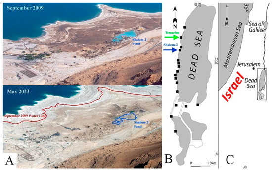 (A) An aerial picture of Mineral Beach resort, Shalem-2 sinkholes cluster, and the sinkhole’s pond (marked in blue) discussed in this paper, as photographed on September 2009 and on May 2023. The resort was abandoned in 2015 and entirely devastated by sinkholes. (B) The location of this sinkhole cluster (blue arrow) and Temarim sinkhole (green arrow) in the context of other sinkhole sites (black squares) in the Dead Sea region. (C) The Dead Sea regional setting (framed).