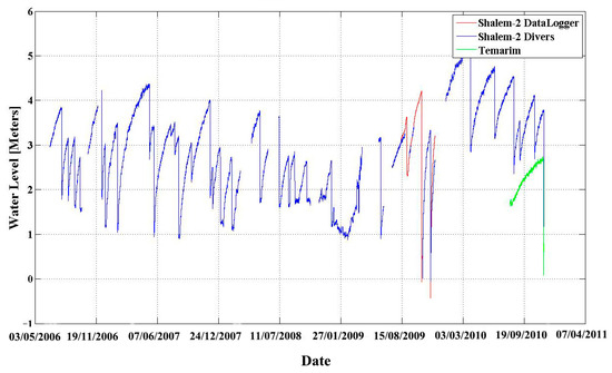 The water level in the Salem-2 sinkhole was monitored over a period of 5 years (Figure 3). From 6 July 2006 to 8 August 2009, the water level in the sinkhole was measured every 5–15 min using either a Solinst Levelogger or Diver pressure and temperature sensors. These sensors were tied to a pole and submerged in the pond’s water. After observing the complexity and the speed of drainage events, the level measurements sampling rate was increased. From 8 August 2009 to 1 December 2009, in addition to the other sensors, the water level was measured every 5 s using a high-resolution data recorder (Campbell CR1000) with an OTT-PS1 pressure and temperature sensor. This sensor was attached to an anchor and submerged in the pond. Water level recordings ended on 23 November 2010. To examine whether similar dynamics of the hydrological system occur in additional sinkholes, the water level was also monitored in the Temarim sinkhole pond, located about 10 km to the north of the Shelem-2 sinkhole (Figure 1). These measurements were taken every 15 min starting 3 August 2010 through to 23 November 2010. Notably, surface water in both sites is recharged by nearby springs.