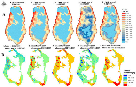 Because the Shalem-2 sinkhole was filled with water most of the time, a significant part of the submerged topography of its floor was not visible. However, on October 22 (Figure 4(A4)), a scan was performed three days after a major drainage event that completely drained the sinkhole. During these three days, the water level, already rising slowly, was at one of the lowest topographic records to be measured in the sinkhole. This allowed the generation of a surface model of the majority of the sinkhole’s floor. Only an area of 1830 m2 out of more than 14,000 m2 was flooded at that time (−13.828 m, local height surveyed by LiDAR). We therefore considered this water level as a zero reference plane for all maps, measured water levels and following calculations. LiDAR scans were taken on 1 June 2009 and 3 August 2009 when the sinkhole was at a relatively high water level. Other scans were taken after drainage events.