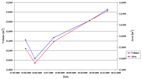 Temporal evolution of the area of the sinkhole at the level of 4.33 m (local height) and the volume of a slice between levels of 3.33 m and 4.33 m (this slice appears above the water level and thus measured in all scans, but it is entirely enclosed inside the bounds of the sinkhole). In general, the sinkhole dimensions are growing with time.