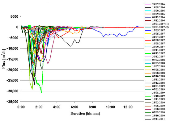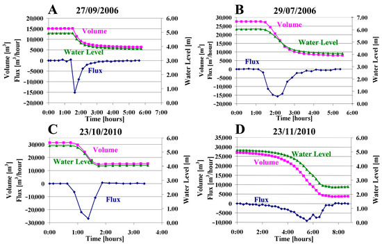 1. The peak of the flux reaches its maximum at the beginning of the event, as was observed in three out of thirty-five events (Figure 7A), suggesting that a structural failure opened the hydraulic connection between the surface water and the underground system. The first reading of the discharge is also the peak of the outflow of the event. The interval between this reading and the previous one is regarded as one stage, as dictated by the data sampling. However, this stage may have been a series of sub-events, through which the hydraulic connection has improved, but which cannot be deciphered.