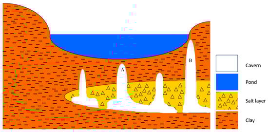 A suggested cross-section from west (left) to east (right) of the sinkhole cluster and pond. Finger-like cavities grow randomly upwards from the dissolving salt layer below the pond, and when reaching critical conditions, a collapse sinkhole is formed by rupturing the pond’s floor. The location and size of the new sinkhole determine the pattern of drainage. A rupture at the bottom of the pond’s floor (A) increases the chances for a major drainage down to lower levels. Alternatively, a rupture on the side (B) will result in a minor drainage event and a higher final water level in the pond.