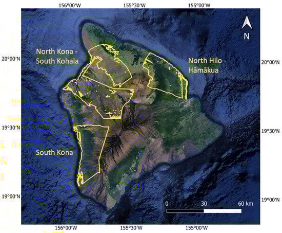 Google Satellite image of Hawai’i Island, showing the three regions mapped in this study.