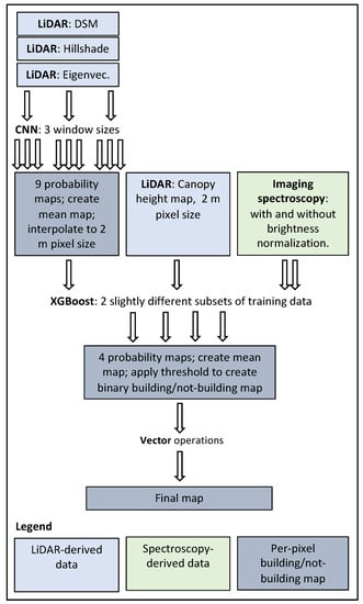 We found the combination of a CNN and gradient boosting with decision trees to be an effective means of segmenting LiDAR and imaging spectroscopy data into building and not-building classes in a highly heterogeneous landscape. The CNN was effective at detecting buildings in the higher-resolution LiDAR data, but also misclassified objects such as tree crowns and ground surface features. Including the CNN-derived probability map along with the imaging spectroscopy bands as features in a gradient boosting model reduced the number of false positive detections. This was in spite of high intra-class variation in spectral properties that results from the wide variety of roofing materials and coatings in the study areas, and spectral similarity between some roofing materials (e.g., asphalt shingle) and landscape features (e.g., rocks). A subsequent set of simple vector operations further refined the final maps.