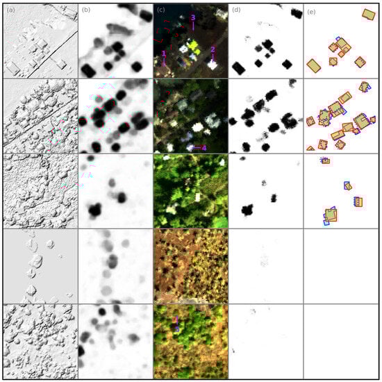 Data inputs and modeling steps for five 150 × 150 m areas of the test regions. Columns: (a) Hill-shaded LiDAR DSM (1 m2 pixels); (b) pixel-wise building probability map created by applying a CNN to the LiDAR data, interpolated to 2 m2 pixels; (c) color image derived from imaging spectroscopy data; (d) pixel-wise building probability map created by modeling imaging spectroscopy and CNN-based map with a gradient-boosting algorithm; (e) vectorized building footprints derived from (d). Blue boxes show manually labelled building footprints, red boxes show modeled building footprints, and dotted purple boxes show building footprints present in the Microsoft US Building Footprint Database []. The upper three rows illustrate the modeling process in locations with buildings occurring in a variety of densities and landscapes. The lower two rows show that the method effectively rejects building candidates in uninhabited areas. Objects whose spectra are shown in Figure 5 are labeled with pink numbers in column (c).