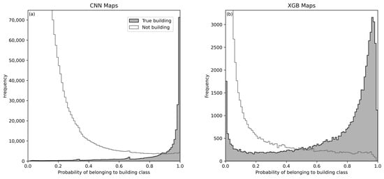 Figure 4b shows that the XGBoost model still did not provide a complete separation between building and not-building pixels in probability space. However, applying a further set of simple operations resulted in final maps with a high detection rate and few false positives. We first created binary maps in which all pixels with building probability > 0.2 were assigned to the ‘building’ class. This threshold approximately corresponds to an inflection point in probability space below which the likelihood of false positives rises rapidly (Figure 4b).