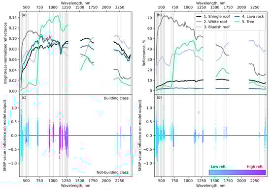Upper plots show spectra of some common objects/materials on Hawai’i Island, from both the building and not-building classes. The spectra in panel (a) have been brightness-normalized, those in panel (b) have not (see text). Lower panels (c,d) show SHAP values for the 30 most important wavelength intervals (as defined by mean absolute SHAP values), for a sample of 1% of the pixels in the XGBoost training data. These plots can be interpreted as follows: at any given wavelength (x position), each scatter point (in y) denotes the reflectance at that wavelength for a pixel in the XGBoost training data. Pixels with low reflectance are cyan and those with high reflectance are magenta. The most influential wavelength regions have high mean absolute SHAP values, averaged over all pixels. At some wavelengths (e.g., around 2250 nm in panel (c)) it is clear that pixels with high reflectance at that wavelength tend to be classed as buildings, and vice versa. The vertical shading connects these influential regions with the example spectra in the upper panels.