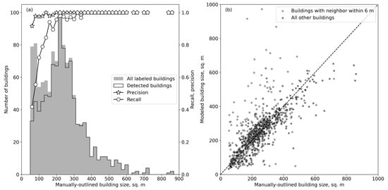 (a): Building detection (recall) rates as a function of building size in the final test region maps. (b) Modeled building sizes vs. manually outlined building sizes (dotted line is the 1:1 relation). For clarity, axis limits exclude five buildings with areas between 1100 and 4700 m2.