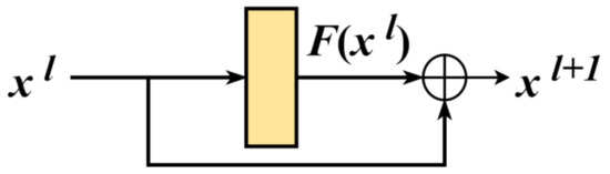 Each residual block is divided into two parts: a direct mapping part and a residual part. is a direct mapping, which is reflected as the lower curve in Figure 2; represents the residual part, typically consisting of two or three convolutional operations, as depicted in the upper part of Figure 2.