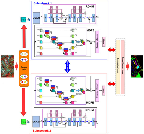 Hyperspectral images (HSIs) have hundreds of continuous bands, and unlike general three-channel images, they provide not only spatial information but also rich spectral information that can be used to distinguish land cover types. Therefore, HSIs have been widely used in forest vegetation cover monitoring [1], land use classification [2,3], change detection [4], anomaly detection [5], environmental protection [6] and other fields. To achieve high accuracy and a strong generalization ability in HSI classification tasks, deep convolutional neural networks (CNNs) have attracted much attention due to their excellent classification performance. The purpose of HSI classification is to classify HSIs into predefined labels in a pixel-by-pixel manner. Labeled data scarcity is a challenging issue in HSI classification tasks as obtaining labeled samples is often time-consuming and labor-intensive.