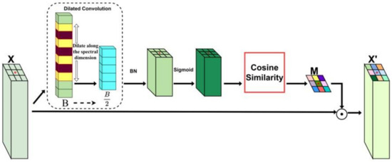 The DCAM expands the receptive field of the spectral dimension through dilated convolution and utilizes the cosine similarity to quantify the importance levels of different pixels in the spatial dimension. It realizes the comprehensive measurement of the spatial-spectral weight of each patch. The diagram of the DCAM is shown in Figure 6. The input patch is first passed through dilated convolution to obtain a feature map with reduced channels. Dilated convolution expands the receptive field of the spectral dimension, effectively preserving the spectral information while reducing the computational complexity by halving the spectral dimension. Then, the sigmoid activation function is applied to restrict the values to (0,1). Next, the cosine similarity between the central pixel and its neighboring pixels is computed to obtain the spatial weight mask . Finally, the weight mask is multiplied with the original input in an elementwise manner to obtain a weighted output , which can be represented mathematically as Formula (4):