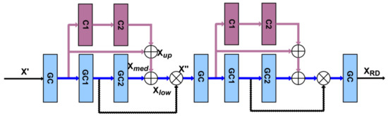 The input of RDHM is , which is also the output of the DCAM. The three GC steps are grouped convolutions, which further achieve dimensional transformation to ensure that the overall feature dimensionality remains consistent. GC1 and GC2 in the intermediate blue branch represent grouped convolutions, which can extract local residual features. C1 and C2 in the upper purple branch represent regular convolutions, which can extract global residual features. The lower black skip branch directly utilizes hierarchical skip connections to extract global dense features. Then, a parallel grouped convolution of the local residual branch produces an output . The global residual branch generates an output , and the global dense branch generates an output . This can be mathematically represented as Formulas (7)–(10):
