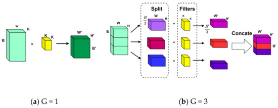 Illustration of grouped convolution. (a) Grouped convolution with grouped number 1, (b) Grouped convolution with grouped number 3. K represents the size of the convolutional kernel, and “*” represents the convolution operation.