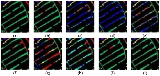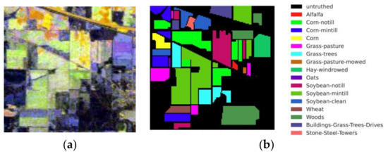 Indian Pines (IP) dataset: The IP dataset is the first batch of HSI data collected by the Airborne Visible/Infrared Imaging Spectrometer (AVIRIS) sensor over the Indian Pines region in northwest Indiana in 1996. The dataset has 220 bands, and 20 noise and water absorption bands (, and ) are excluded, leaving 200 bands available for the experiment. The dataset has images with pixels. It includes 16 classes of land cover. The details are shown in Table 2. A pseudocolor image and its corresponding ground truth image of IP are shown in Figure 12.