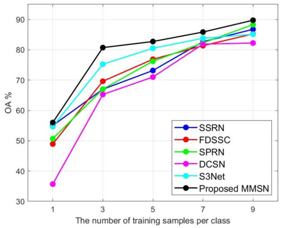 This section discusses the effects of different numbers of raining samples. For each class of the PU dataset, experiments are conducted using 1, 3, 5, 7 and 9 labeled samples per class as training samples, and the proposed MMSN was also compared with the SSRN, FDSSC, SPRN, 3DCSN and S3Net, which achieved a better performance in the comparison. The OA results obtained with different numbers of training samples are shown in Figure 18. It can be observed that with the increase in the number of training samples, the OAs of all the methods have an upward trend due to the increased amount of available sample information. The proposed MMSN consistently achieves the highest OAs among all of the methods under different numbers of training samples. This indicates that the proposed MMSN has a superior classification advantage, particularly in cases with few-shot training samples.