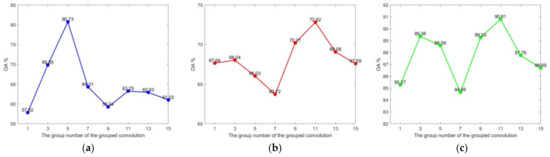 To validate the impact of the number of groups in the grouped convolutions on the resulting classification performance, we conduct comparative experiments with different numbers of groups. The numbers of groups are set from 1 to 15 with intervals of 2, and the specific OA results are shown in Figure 19. When the number of groups is 1, grouped convolutions are not used, and a simple CNN directly extracts the features from the entire spectral band. On the PU dataset, the OA reaches its maximum value of 80.73% when the number of groups is 5, which is 23.21% higher than that obtained when not using grouped convolutions (when the number of groups is 1). On the IP dataset, the OA reaches its maximum value of 72.82% when the number of groups is 11, which is 5.16% higher than that obtained when not using grouped convolutions. Similarly, on the SA dataset, the OA reaches its maximum value of 90.81% when the number of groups is also 11, which is 5.54% higher than that obtained when not using grouped convolutions. Therefore, it can be concluded that grouped convolution operations are effective for classification. Indeed, we also observed that using grouped convolution does not always lead to improved classification accuracy because it may destroy the continuous identification information of the spectral dimensions by dividing the spectral bands into segments with equal widths. By selecting an appropriate number of groups, we can better utilize the available spectral information and achieve an improved classification performance.