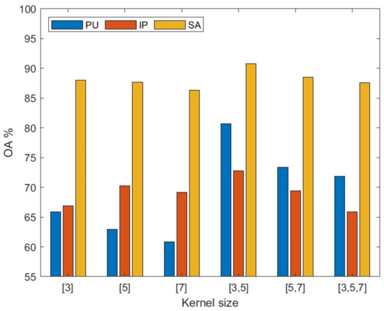 To verify the impact of the multiscale convolution process with multikernels in the MDFE module, different single kernel sizes of as well as multiscale convolution with multikernels possessing different kernel size combinations of are compared. means that the kernel size is ; denotes the multiscale convolution process with multikernels constructed by two parallel grouped convolutions with kernel sizes of and ; and represents the multiscale convolution process with multikernels constructed by three parallel grouped convolutions with kernel sizes of , and . The OA results are shown in Figure 20. It can be observed that the use of multiscale convolution with multikernels can achieve higher OAs than those produced using single kernel convolutions . This verifies the effectiveness of multiscale convolution with multi-kernels. Smaller kernel sizes can better capture local details, while larger kernel sizes can better capture global contextual information. Multiscale convolution with multikernels can comprehensively utilize information from different scales. Furthermore, in the multiscale convolution operation with multikernels, the trade-off between local and global information needs to be considered. By using different kernel size combinations, the local and global features can be effectively integrated, resulting in better classification results. According to Figure 20, it can be seen that with the kernel size combination of the multiscale convolution with multikernels achieves the highest OA values on all three datasets. Therefore, in the proposed MMSN, multiscale convolution with multikernels of is adopted.