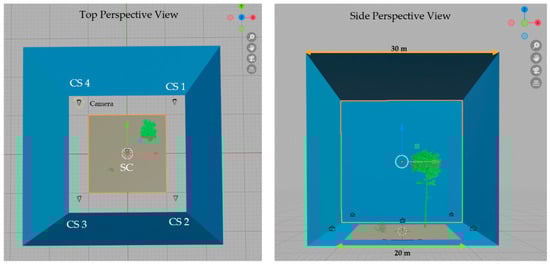 In our study, we set up cameras in the scene to serve as vantage points from which the lidar sensor would capture data. The position of the cameras emulated their real-world counterparts. We set up our sensor to use a rotating sensor type with a horizontal and vertical field of view of 360°, with a step size of 0.2° in both the X and Y direction. This yielded a total of 3.24 million points per scan. The step size determined the resolution of the sensor with smaller step sizes resulting in higher point densities. This approach assumes that there is no beam divergence resulting in a beam width that is constant. We simulated one scan from the center (SC = 0, 0, 0) of the forest plot at a height of 2 m (0, 0, 2) and a scan from each corner of the plot (CS 1–4) (Figure 2, triangles). For the corner plot scans, we placed the virtual camera (origin of the scanner) 2 m away from the ground plane. The coordinates (X, Y, Z) relative to the plot center were as follows: CS 1 = (12, 12, 2), CS 2 = (12, −12, 2), CS 3 = (−12, 12, 2) and CS 4 = (−12, 12, 2). We did not set a maximum distance limit that the beam could travel; instead, we enclosed our plot in a 30 × 30 × 30 m box (6 planes) with an opaque material (Figure 2, blue planes). This acted as a barrier and allowed us to capture all pulses that would otherwise have no associated return. Recording these points is helpful for determining occlusion and accounting for all transmitted laser pulses in subsequent calculations. We visualize the top and side view of our plot and camera setup in Figure 2. The final step was to save these scans to disk in .laz format for further analysis. Similar to the plot generation, we automated the lidar simulation process for all plots using the Python API.