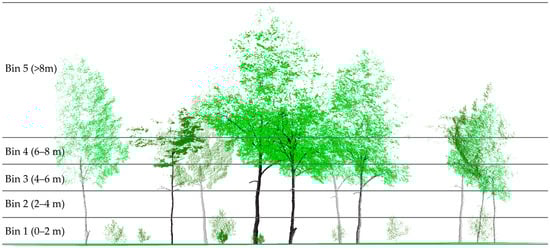 Conceptualization of vertical height bins used to calculate summary metrics. Vegetation is represented as synthetic TLS point clouds.