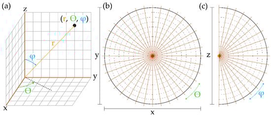 Conceptualization of transformation into spherical coordinates (θ, φ, r) from Cartesian coordinates (X, Y, Z) relative to the sensor location. (a) θ, φ, r relative to X, Y, and Z axes. (b) Angles of θ relative to a plane defined by the X and Y axes. (c) Angle of φ defined by angle relative to the Z axis.