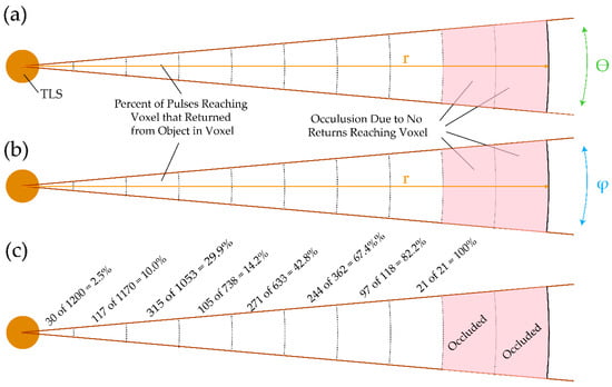 Summarization of areas of gaps, areas of occlusion and percent of pulses reaching a spherical voxel that returned from that voxel using a spherical coordinate system. (a,b) represent angles of θ and φ segmented into ranges of r while (c) conceptualizes the calculation of the percentage of pulses returned from a volume and determination of what volumes were occluded.