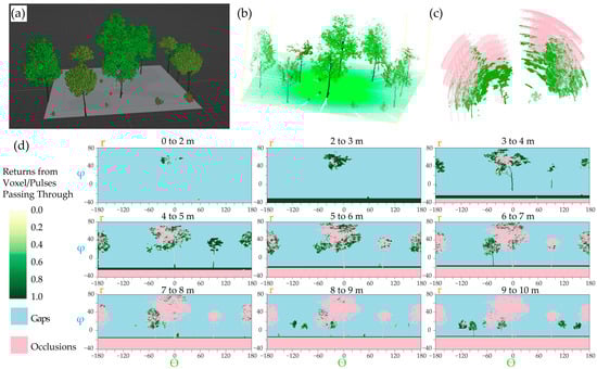 Figure 6 further conceptualizes the process of calculating metrics using spherical voxels. Once a synthetic plot (Figure 6a) is generated, it is synthetically scanned to create a point cloud in 3D Cartesian space (Figure 6b). These coordinates are then converted to spherical coordinates. By keeping track of the number of pulses passing through a given angle of θ and φ and the radial distance of each return from the sensor, it is possible to calculate the number of returns from each spherical voxel then normalize these values by the number of pulses passing through that volume. Volumes that have pulses passing through but no associated returns can be labeled as true gaps while those with no returns passing through, or where all available pulses were returned prior to reaching the volume of interest, can be labeled as areas of occlusion. In Figure 6c, all points represent the center of a spherical voxel. Pink points represent voxels that were occluded while green points represent voxels with returns. Figure 6d conceptualizes these results such that the X-axis shows angles of θ, the Y-axis shows angles of φ, and each image shows a range of radial distance from the scanner location. Blue represents gaps, pink represents areas of occlusion, and shades of green represent, for voxels that were not occluded or gaps, the proportion of pulses intersecting a voxel that were returned from that spherical voxel. It is important to note that performing these calculations required accounting for all transmitted pulses, not just those with an associated return. This was accomplished in the synthetic space by including barriers around each plot. If a pulse did not return from either the ground or an object in the plot, then it would return from the barriers. Such accounting of all transmitted pulses is more difficult using real TLS data since the pulses without associated returns and their associated angles of transmission are not always recorded or made available to the end user.