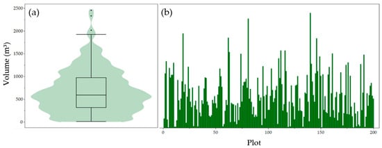 We aimed to create randomized forest plots with varying densities. Table 3 provides descriptive statistics highlighting volume variability across the synthetic plots. Figure 7 shows the distribution of volume, as represented using violin and boxplots for all plots, as well as a histogram showing variability within individual plots. The mean volume across all plots was 593.56 m3. The least dense plot (plot 181) had a volume of 11.72 m3 while the densest plot (plot 140) had a volume of 2453 m3. Plot 181 only consisted of two pine trees and two small shrubs. In contrast, plot 140 consisted of 11 shrubs, 6 pine trees, and 9 deciduous trees.