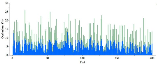 Descriptive statistics of the percentage of surface area occlusion across the synthetic plots.