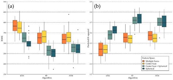 Figure 9 shows the distribution of the RMSE (Figure 9a) and predicted R-squared (Figure 9b) for estimating plot-level vegetation volume using 20 model replicates of each feature space and the algorithm combination, for a total of 240 models. Generally, the RF and SVM models performed similarly while outperforming the kNN models regardless of the feature space used. This could partially be attributed to kNN not being robust to a large feature space. Performing variable selection or variable reduction, such as principal component analysis (PCA), may have allowed for improved performance from the kNN algorithm. Given the large feature space provided and the correlation between predictor variables, RF and SVM were generally more appropriate algorithms for this specific task.