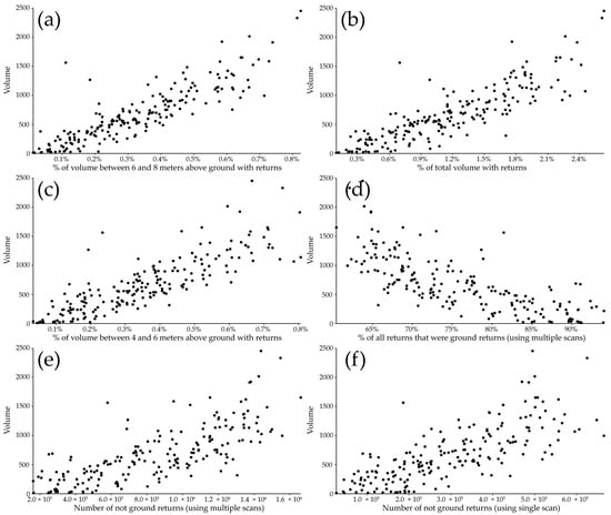 Figure 10 below provides scatterplots to visualize the relationship between plot-level vegetation volume and the six variables that were found to be most highly correlated with this measure, as estimated using the Spearman correlation coefficient, a measure of monotonic and non-linear correlation. The variable with the largest correlation with the vegetation volume was the percentage of the volume between 6 and 8 m above ground with returns (Spearman correlation coefficient = 0.880). The next two highest correlated variables were also derived using the spherical method, all with correlations higher than 0.850. The next two variables were derived using all five scans: the percentage of returns that were not ground returns and count of returns that were not ground returns. The last variable, with a Spearman correlation of 0.772, was the number of returns not ground returns calculated using only the single, center scan.
