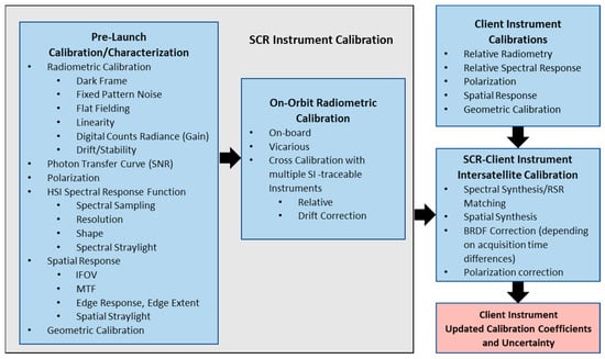 The SCR is assumed to be well-calibrated, stable, and highly characterized to meet this radiometric transfer uncertainty goal, as described in Figure 1. Thorough pre-launch SCR laboratory-based measurements are critical and should include: radiometric and geometric calibrations including full dark frame measurements; spectral and spatial response measurements; photon transfer curve measurements; and polarization sensitivity measurements. After launch, regularly occurring on-orbit radiometric calibrations, including those using any onboard sources and vicarious methods, as well as cross-calibrations with multiple well-calibrated SI-traceable systems that track drift, and that are preferably hyperspectral, should also be performed. Cross-calibrations can then be performed between the well-calibrated and monitored SCR and client instruments to transfer the radiometric calibration back to the client instrument. Cross-calibrations between the reference instrument and the SCR, and between the client instrument and the SCR are performed in a similar fashion.