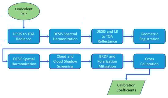 The near-coincident cross-calibration workflow contains six elements, as shown in Table 5. In this study, cloud/cloud shadow screening was accomplished as part of the identification of near-coincident DESIS/L8 image pairs by screening for only cloud-free imagery. Likewise, BRDF and polarization correction/mitigation was accomplished as part of the image pair selection process by only selecting image pairs acquired within 3.5 min of each other and with view zenith angles within 7°. The remaining workflow elements are discussed below.