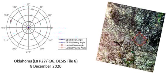Figure 3 describes an example DESIS/L8 OLI image pair over Oklahoma (L8 P27/R36 and DESIS Tile 8). The figure includes a polar plot of the image pair’s solar (zenith and azimuth) and sensor viewing (zenith and azimuth) angles. It also shows how the footprints of each image lie on the Earth with respect to each other.