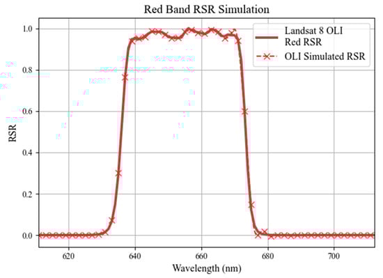 Spectral synthesis is used to simulate a multispectral bandpass from multiple hyperspectral bands [23,24,25]. The spectral sampling and FWHM of the hyperspectral bands must be fine enough that when used to synthesize multispectral bands, they produce small TOA radiometric errors. CLARREO and TRUTHS, for example, have FWHM values that are ~2× the sampling frequency to reduce the effects of aliasing. Since spectral errors are mapped into radiometric errors, it is critical for the reference and client instruments’ RSRs to be well known.
