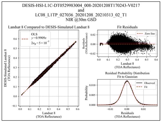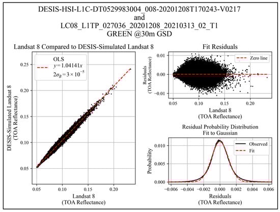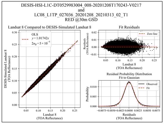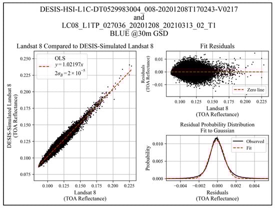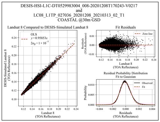 Example regression plots that transfer calibration from a reference to an SCR, and their associated residuals for the coastal aerosol, blue, green, red, and NIR bands are shown in Figure 10, Figure 11, Figure 12, Figure 13 and Figure 14 for the Oklahoma image pair discussed above (L8 P27/R36; DESIS Tile 8, baseline 30 m GSD). The example shown is a highly vegetative site, so apart from the NIR band, the TOA reflectances cover a narrow range of values. These figures give uncertainties at the 95% confidence interval (2σ). Fit residuals show near-ideal normal distributions with peak-to-peak ranges less than 0.02 in all cases consistent with the COV threshold. Residual distributions were fit to a Gaussian function and qualitatively show high quality fits. Additionally, a Kolmogorov–Smirnov normality test was performed and confirmed residual distributions likely belong to the fit Gaussian distributions.